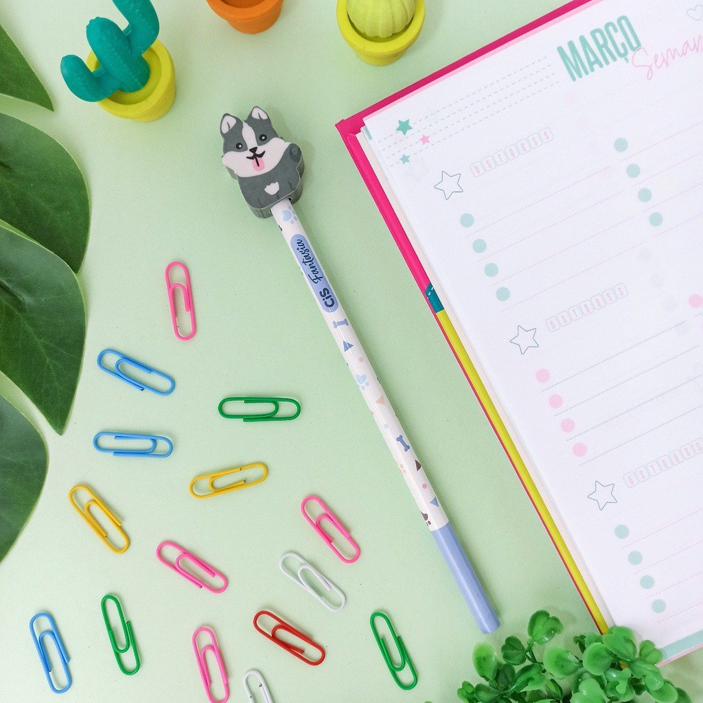 Esse é para quem ama cachorrinhos, além do lápis preto HB ser todo colorido e redondo, vem com uma linda borracha em formato de cachorrinho na ponta. E cada cor de lápis tem um cachorrinho diferente.